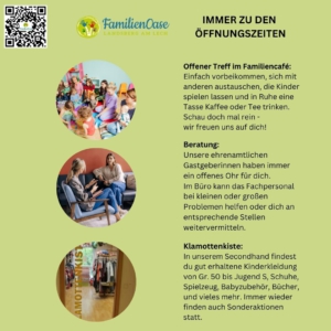In unserer Familienoase finden Alleinerziehende, Eltern oder Großeltern Kontakt zu anderen Familien mit Kindern, kompetente Ansprechpartner für Fragen oder ein umfangreiches Spiel- und Aktionsangebot inklusive Second-Hand-Laden rund ums Kind.